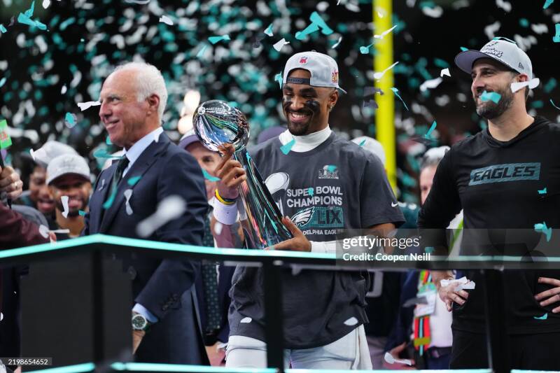 NEW ORLEANS, LA - FEBRUARY 09: Jalen Hurts #1 of the Philadelphia Eagles holds the Vince Lombardi Trophy after defeating the Kansas City Chiefs during Super Bowl LIX at Caesars Superdome on February 9, 2025 in New Orleans, Louisiana. | Retrieved from Gettyimages.